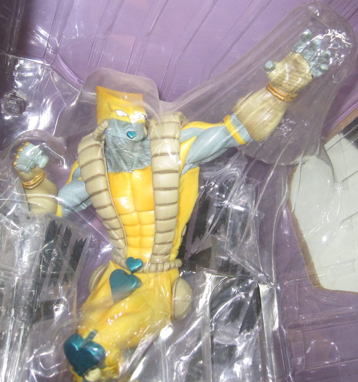 ザ・ワールドは、物語のラスボスであるDIOが操るスタンドで、時間を数秒間停止させるという強力な能力を持っています。このフィギュアでは、その圧倒的な存在感と威圧感を感じさせるポージングが魅力となっており、まるで作中の激しい戦闘シーンの一瞬を切り取ったかのような躍動感のある造形が特徴です。